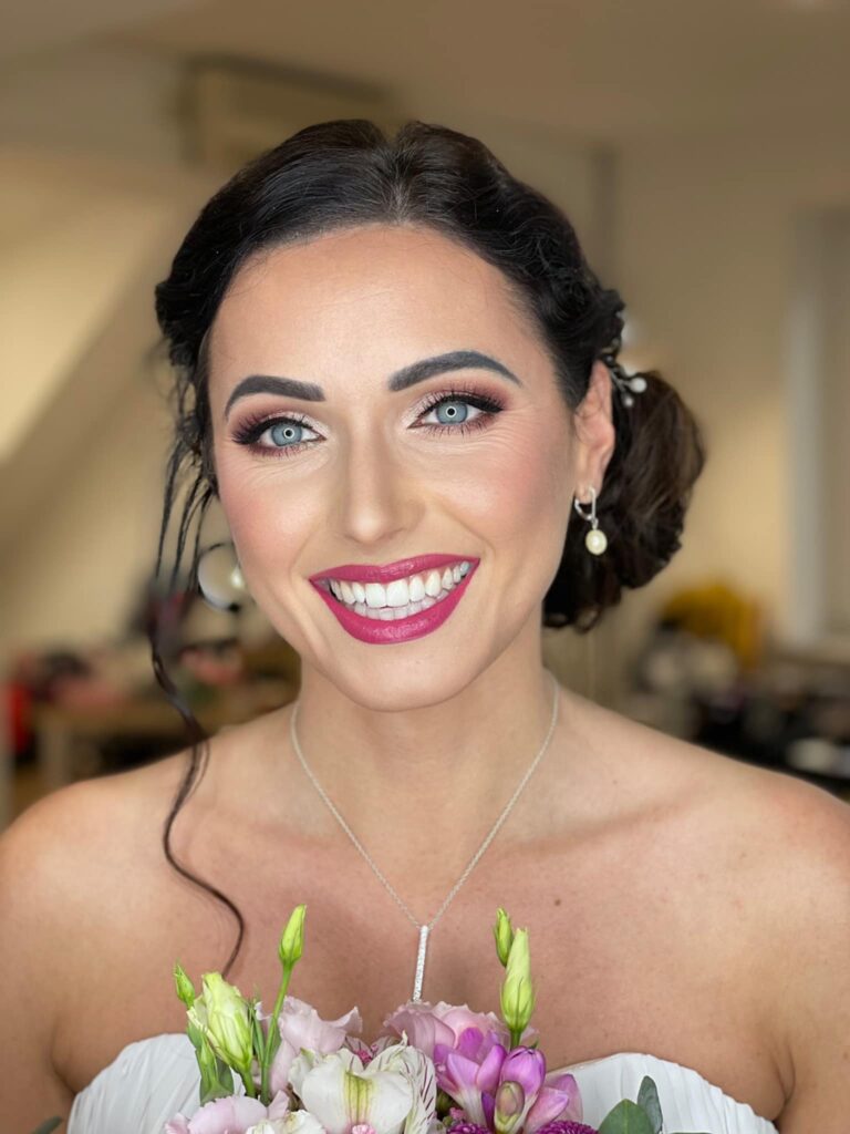Zkouška líčení / účesu před svatbou, fixovaný dlouhodržící make-up nebo účes v den svatby, lepení trsů řas. Asistence při oblékání do svatebních šatů.